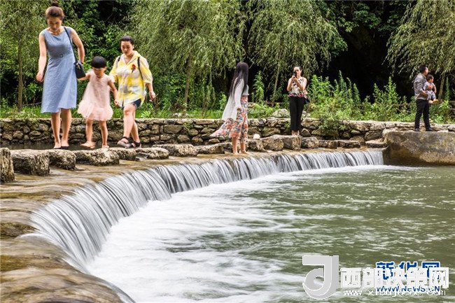 7月11日,在貴州省大方縣黃泥塘鎮(zhèn)烏溪生態(tài)農(nóng)業(yè)避暑園,人們在水邊戲水納涼。