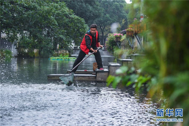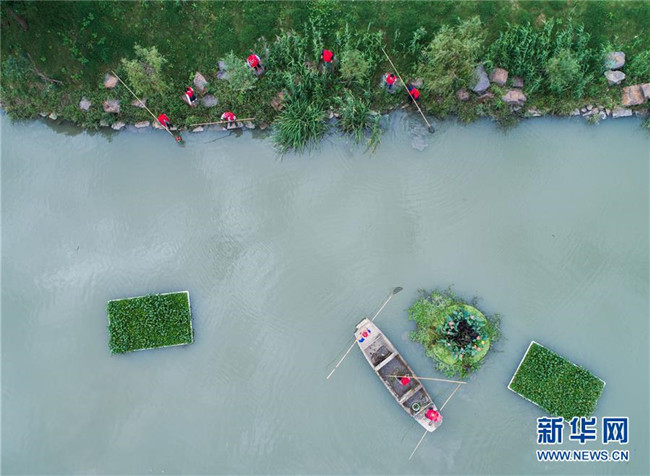 在浙江省長(zhǎng)興縣劉家渡河道南太湖段,河長(zhǎng)帶領(lǐng)專職保潔人員進(jìn)行日常鄉(xiāng)村河道護(hù)理(2017年10月13日無人機(jī)拍攝)。