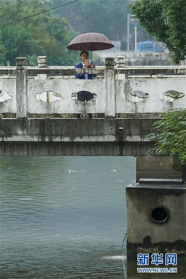 在江蘇省無錫市濱湖區(qū)馬山街道西村社區(qū),顧家瀆河河長(zhǎng)鈕建春在巡查村中河道時(shí)拍攝雨水出水口情況(2017年10月12日攝)。