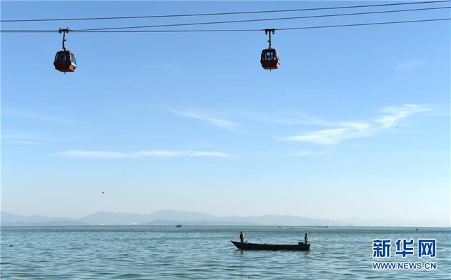 下方是工作人員在滇池上準(zhǔn)備打撈垃圾和雜物,上方是游客乘坐纜車在觀賞滇池景色(2017年11月14日攝)。云南省昆明市滇池流域自2008年以來實(shí)行河長(zhǎng)制,河道生態(tài)環(huán)境和水質(zhì)得到明顯改善。