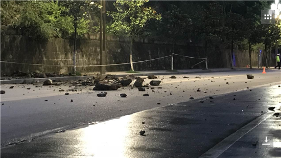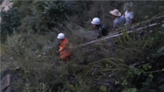接到報(bào)警后,大隊(duì)及專(zhuān)職隊(duì)迅速出動(dòng)兩輛消防車(chē)和10名官兵趕赴現(xiàn)場(chǎng)進(jìn)行處置,到達(dá)現(xiàn)場(chǎng)后,指揮員迅速帶領(lǐng)4名戰(zhàn)斗員立即對(duì)險(xiǎn)情進(jìn)行偵查。通過(guò)現(xiàn)場(chǎng)偵查,發(fā)現(xiàn)在距離路面高約50米的山梁上,幾個(gè)石塊直徑約1米大小,由于連續(xù)幾日暴雨,石塊下土層已經(jīng)流失,導(dǎo)致石塊部分懸空,隨時(shí)都有掉落的危險(xiǎn)。此時(shí)已近夜晚,模糊不清的環(huán)境無(wú)形中增加現(xiàn)場(chǎng)處置的難度。指揮員下令,分兩組進(jìn)行處置,一組由5名戰(zhàn)斗員跟隨一名熟悉該山道路的群眾一起上山,處置"懸石”險(xiǎn)情,一組與交警部門(mén)拉起警戒線隔離過(guò)往車(chē)輛和行人。由于“懸石”處無(wú)路可通,戰(zhàn)斗員在上到山梁后,系上安全繩下降到懸石旁利用事先準(zhǔn)備好的鋼釬對(duì)石塊進(jìn)行起拗,在經(jīng)過(guò)兩個(gè)多小時(shí)的作業(yè)后,全部懸石終于掉落路面,使隱患徹底消除。