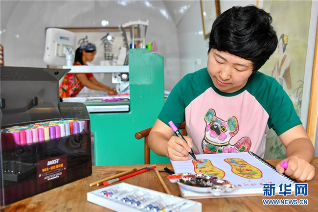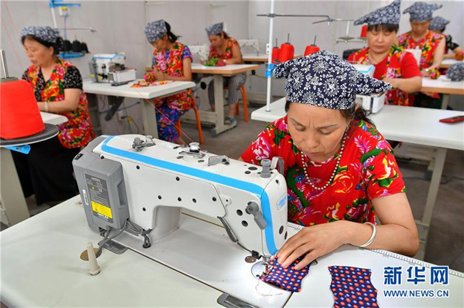 山西省臨縣寨則坪村是呂梁山上典型的貧困村。2017年5月,該村邀請縣里的老手藝人對10余位婦女進(jìn)行布藝加工的集中培訓(xùn),并在村委院子里建起了布藝加工廠。靠著加工富有當(dāng)?shù)靥厣男瑝|、肚兜、布老虎等工藝品,這些婦女每月能拿到1500元的工資,這幫助她們順利摘下了“窮帽子”。新華社記者 曹陽 攝