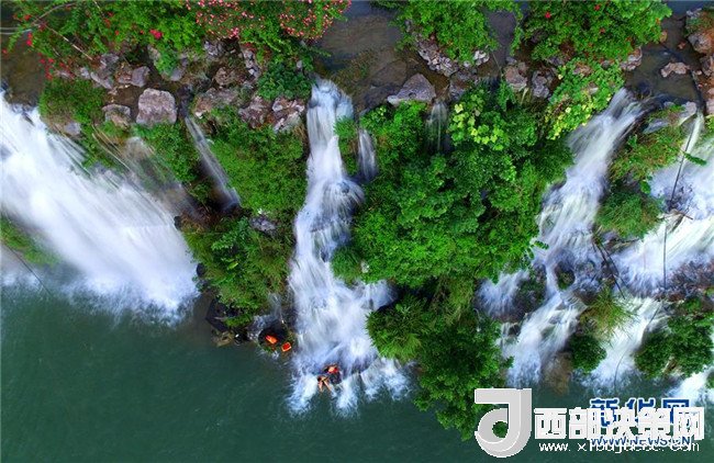 7月18日,市民在廣西柳州市蟠龍山瀑布群下戲水消暑(無人機(jī)拍攝)。