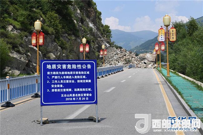 這是五臺山景區(qū)管委會在梵仙山路段山體崩塌現(xiàn)場設(shè)置的警示牌(7月21日攝)。受降雨影響,山西五臺山景區(qū)于7月19日和20日發(fā)生兩起山體崩塌地質(zhì)災(zāi)害,沒有造成人員傷亡和車輛損失。新華社發(fā)(楊晨光攝)