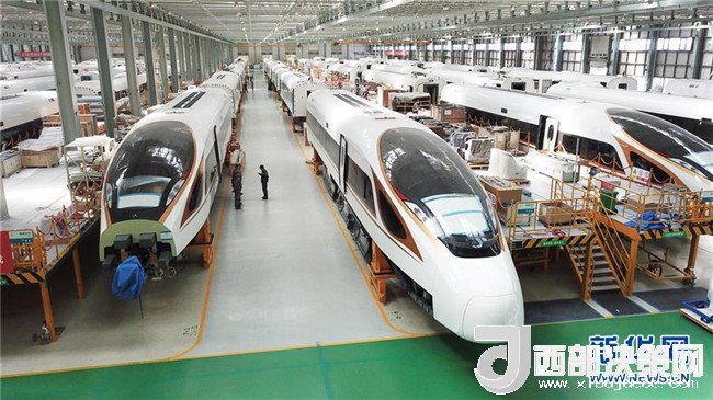 在位于吉林長春的中車長客股份公司高速動車組裝配車間里,幾列“復興號”中國標準動車組在進行裝配(2017年9月14日攝)。新華社記者張楠攝