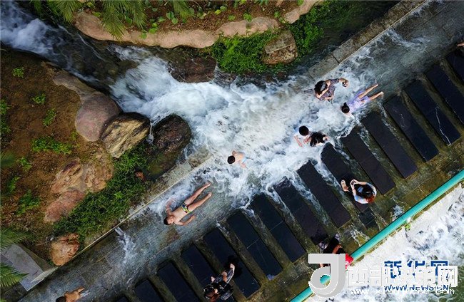 7月29日,市民在廣西柳州市窯埠古鎮(zhèn)人工瀑布群下消暑納涼(無(wú)人機(jī)拍攝)。