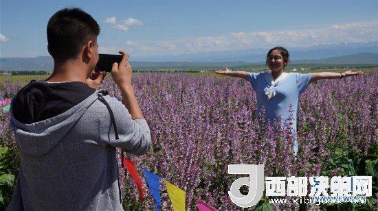 8月1日,來自新疆霍爾果斯的游客在新疆昭蘇縣一處香紫蘇花海景區(qū)拍照留影。新華社記者黃臻攝