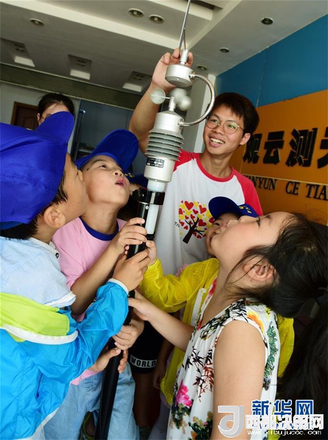 8月2日,江蘇鎮(zhèn)江市寶塔路街道潤州花園社區(qū)的小朋友在丹徒國家基本氣象站觀察體驗(yàn)便攜自動(dòng)氣象站的功能。 新華社發(fā)(石玉成 攝)