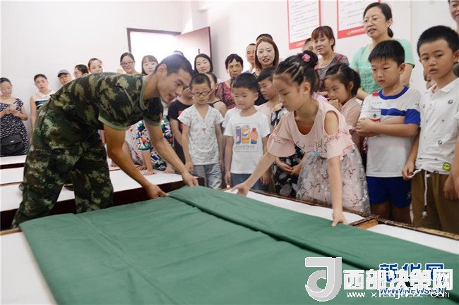 8月2日,湖北省宜昌市秭歸縣實(shí)驗(yàn)小學(xué)的學(xué)生和家長在縣消防中隊(duì)體驗(yàn)整理內(nèi)務(wù)。 新華社發(fā)(王輝富 攝)