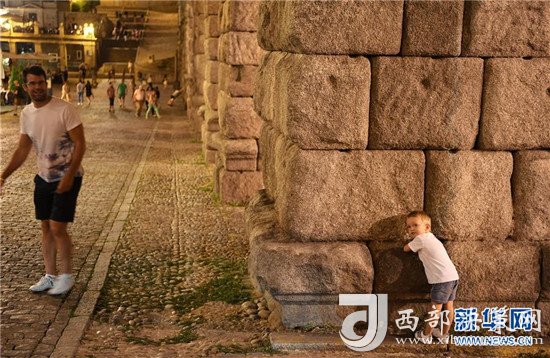 8月5日,在西班牙塞哥維亞,游客在觀景臺上欣賞古羅馬輸水道夜景。