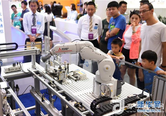 觀眾在2018世界機器人大會上參觀一款工業(yè)機器人(8月15日攝)。 新華社記者 張晨霖 攝
