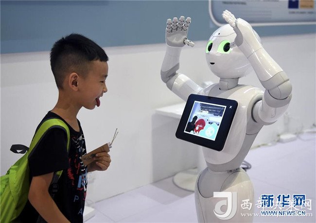 一名小朋友在2018世界機器人大會上與機器人進行互動(8月16日攝)。 新華社記者 羅曉光 攝