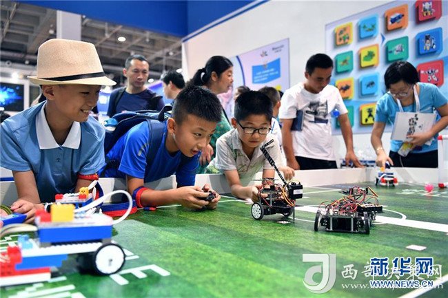 三名少年在2018世界機器人大會一處展臺體驗編程機器人(8月15日攝)。 新華社記者 李鑫 攝