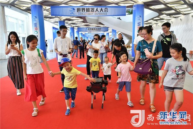 孩子們在2018世界機器人大會上跟隨一款四足機器人(8月15日攝)。 新華社記者 李鑫 攝