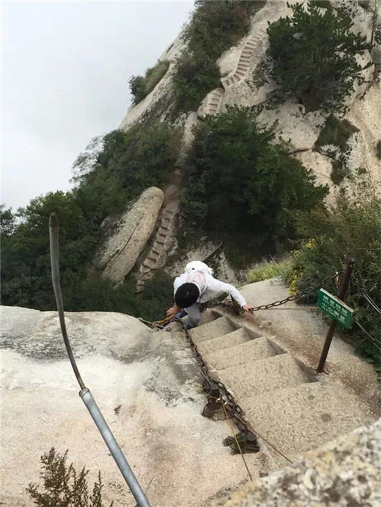 從視覺沖擊上來看,鷂子翻身比不上長空棧道,但鷂子翻身的難度更大一些。首先梯道傾斜,且向內(nèi)傾斜。其次鐵鏈太松動,左右搖擺度偏大,不易抓牢。再者人是從上往下攀緣,崖壁往里傾,眼睛看落腳點有點困難。這就需要手、眼、腳、膝的全面配合了。在鷂子翻身的全途中,不能有絲毫的松懈。手要抓緊,眼要看準(zhǔn),膝要頂住,腳要踩穩(wěn)。全神貫注,集中精神。論難度,這鷂子翻身比長空棧道要多一顆星。小心翼翼,看不見就用腳來試探。一步一個坑的往下攀巖。有一小段只有一邊的鐵鏈可以抓握。這一段需要掌握好身體的平衡度。