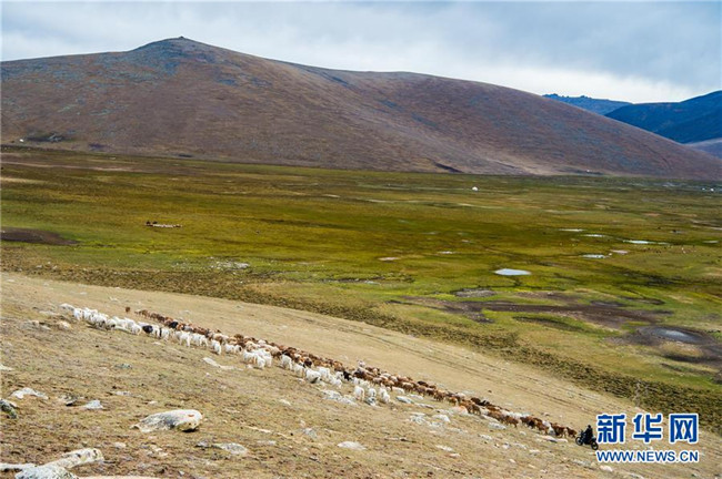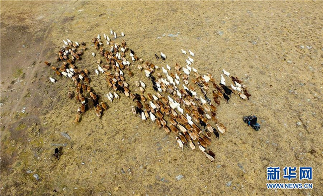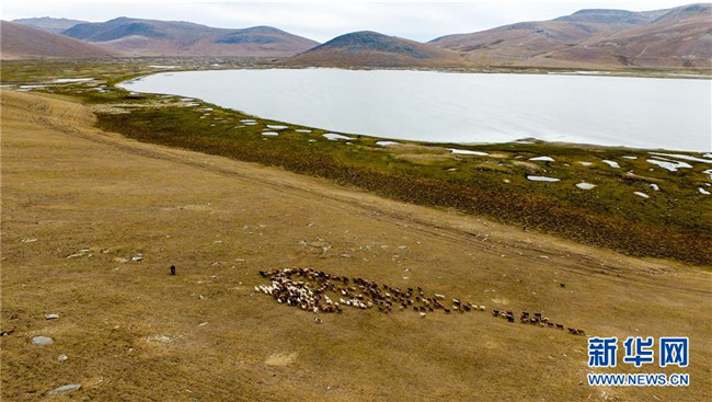 在青河縣查干郭勒鄉(xiāng)薩爾布拉克村,胡賽因·哈力都拉趕著羊群轉(zhuǎn)場(8月25日無人機拍攝)。新華社記者江文耀攝