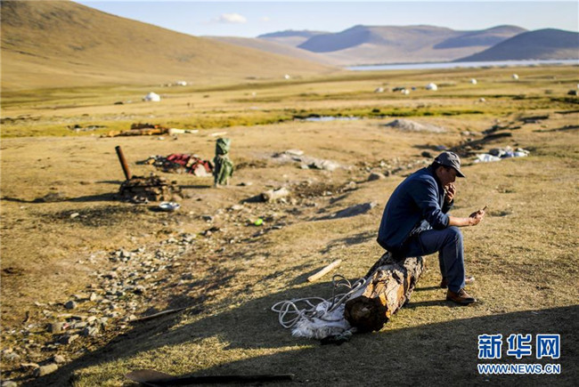 在青河縣查干郭勒鄉(xiāng)薩爾布拉克村,胡賽因·哈力都拉在牧場上用手機上網(wǎng)(8月23日攝)。新華社記者江文耀攝