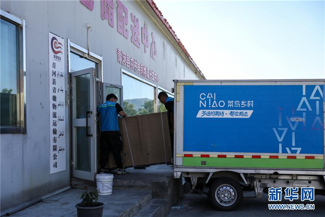 快遞員從青河縣農(nóng)村電商物流分撥中心將網(wǎng)購的摩托車運上快遞車(8月24日攝)。新華社記者江文耀攝