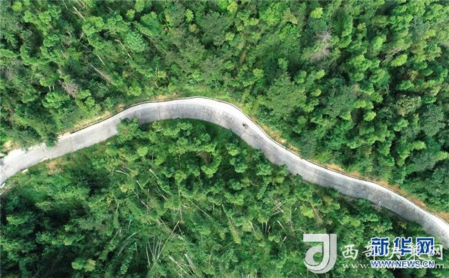 高自仁駕駛助力車行駛在前往梅嶺鎮(zhèn)立新村立新學(xué)校的山路上(9月4日無人機拍攝)。新華社記者 彭昭之?dāng)z
