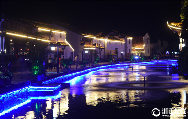 9月10日傍晚,杭州富陽(yáng)東梓關(guān)村亮燈工程開(kāi)啟,村里的屋檐走廊被霓虹燈照亮,古村就像一顆夜明珠,璀璨奪目。昔日傳統(tǒng)村落華麗轉(zhuǎn)身,正吸引越來(lái)越多的游客前來(lái)游玩。(浙江在線記者 吳元峰 攝)