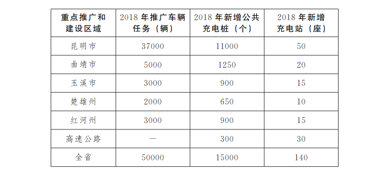 新能源汽車推廣的具體目標為:重點圍繞私人購車、政府采購、公共出行、城市物流以及旅游等領(lǐng)域,在昆明市、曲靖市、玉溪市、楚雄州、紅河州等滇中城市群和重點旅游城市及景區(qū),2018年推廣5萬輛新能源汽車。其他州、市不下達推廣任務(wù),由州、市人民政府結(jié)合實際積極推廣新能源汽車。