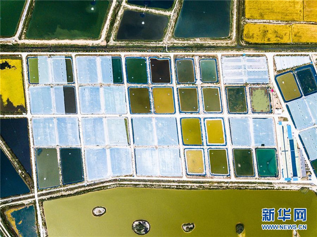 寧夏賀蘭縣藍(lán)灣生態(tài)園南美對蝦養(yǎng)殖基地(9月11日無人機(jī)拍攝)。 寧夏,地處中國西北腹地。這里的大山、大河、草原、沙漠、湖泊,猶如一幅幅美妙畫卷,讓人流連忘返。 新華社記者 王建華 攝