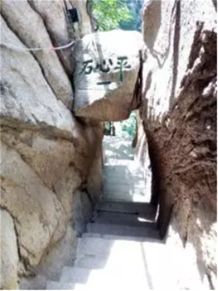 過(guò)千尺幢就是百尺峽。說(shuō)千尺幢艱險(xiǎn),是每個(gè)爬華山的人都能體驗(yàn)得到的,而百尺峽就不是那樣的險(xiǎn)要了。但當(dāng)你上了百尺峽以后,眼前的一幕會(huì)讓人產(chǎn)生驚訝和不安。原來(lái),在兩壁夾縫處有一塊懸石,似落非落的樣子,上面寫著“驚心石”三個(gè)字。人須從石下穿過(guò),讓人不由得擔(dān)心它的穩(wěn)定性來(lái),許多人產(chǎn)生畏葸不前的情緒來(lái)。待鼓足勇氣從石頭下走過(guò)去,回頭一看,又有“平心石”三個(gè)字在石頭上,才知是庸人自擾,虛驚一場(chǎng)。