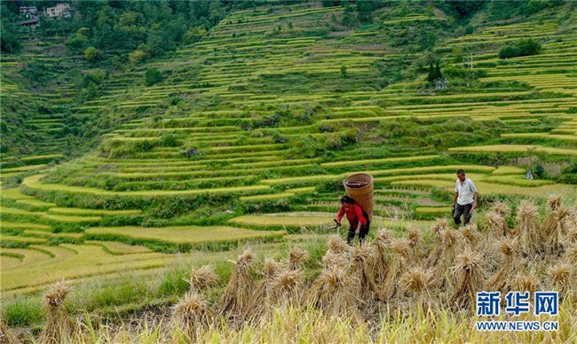 9月19日,花田鄉(xiāng)何家?guī)r村村民冉紅兵(右)齊書仙夫婦收獲稻米后回家。記者劉潺攝