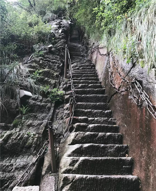 千尺幢:一條峭壁上的大裂縫,陷在兩旁的巨石之間,共370余級臺階,坡度極陡,每級臺階的寬度不過三分之一的腳掌。 俯視腳下,如臨深淵。