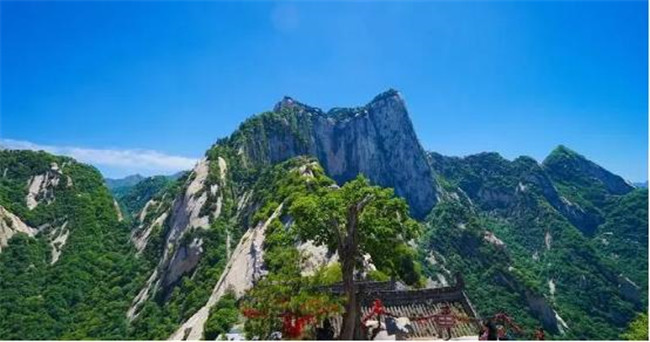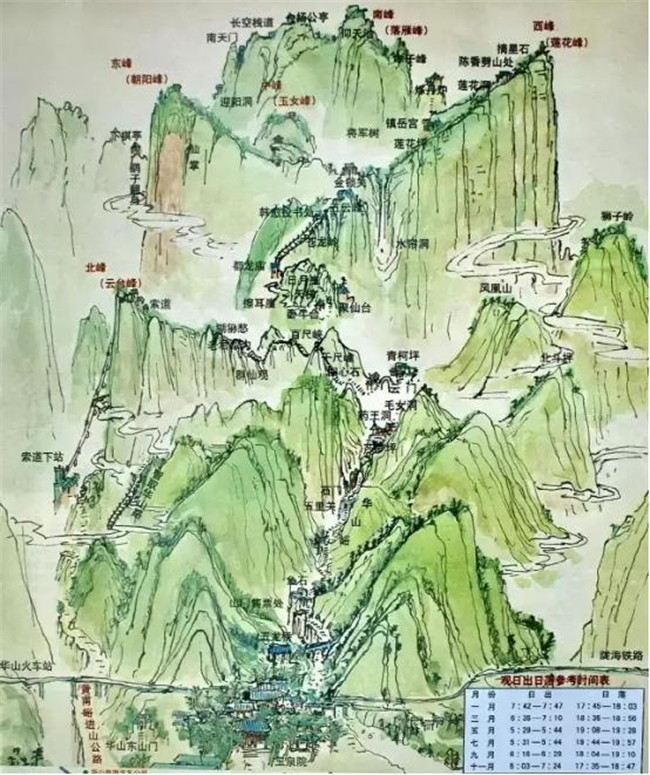 又因峰巔有巨石形狀好似蓮花瓣,古代文人多稱其為蓮花峰、芙蓉峰。西峰為一塊完整巨石,渾然天成。西北絕崖千丈,似刀削鋸截,其陡峭巍峨、陽剛挺拔之勢是華山山形之代表,因此古人常把華山叫蓮花山。西峰南崖有山脊與南峰相連,脊長300余米,石色蒼黛,形態(tài)好像一條屈縮的巨龍,人稱為屈嶺,也稱小蒼龍嶺,是華山著名的險道之一。