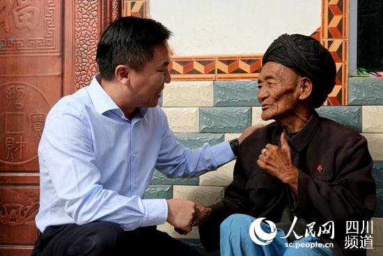 中國電信劉桂清副總經(jīng)理與彝族群眾親切交談,泡爾灣村90歲彝族老黨員稱贊電信扶真貧、真扶貧。