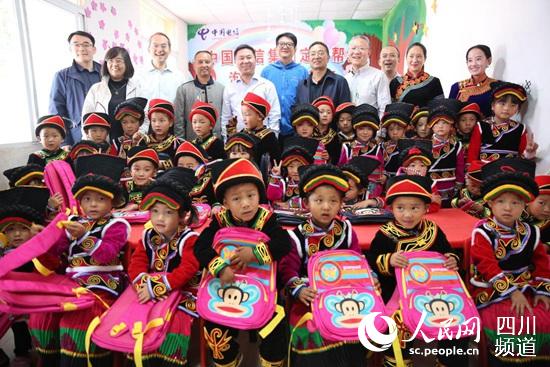 中國電信副總經(jīng)理劉桂清看望慰問泡爾灣村幼教點孩子,并與孩子們合影留念。