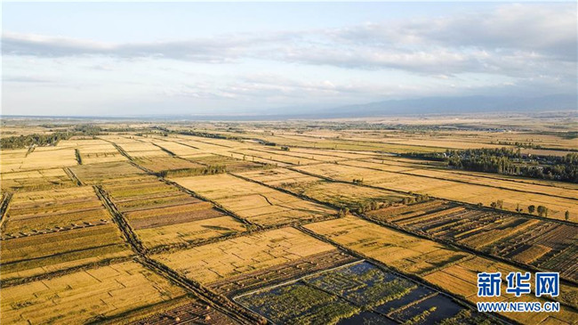 新疆察布查爾錫伯自治縣坎鄉(xiāng)待收割的水稻(9月25日無人機(jī)拍攝)。眼下,地處新疆伊犁河谷的察布查爾錫伯自治縣約20萬畝水稻迎來收割季。當(dāng)?shù)剞r(nóng)民搶抓農(nóng)時(shí),忙碌在金色田園中。記者 胡虎虎 攝