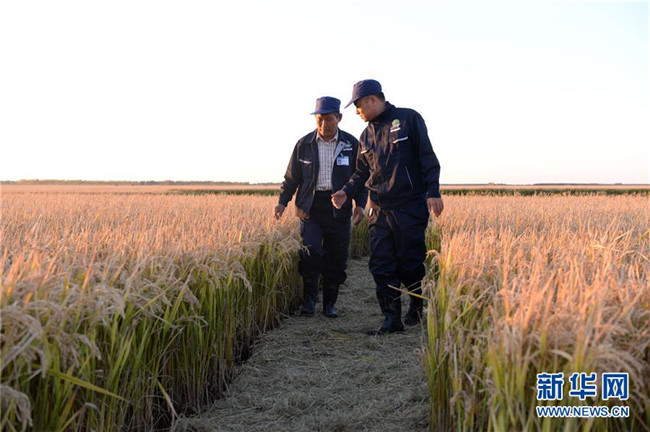 黑龍江建三江七星農(nóng)場(chǎng)職工秦泗利(左)和工友在查看今年水稻的長(zhǎng)勢(shì)(9月26日攝)。 新華社記者王凱攝