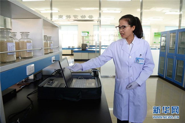 黑龍江北大荒建三江國(guó)家農(nóng)業(yè)科技園區(qū)工作人員裴鑫宇在做谷物品質(zhì)檢測(cè)(9月27日攝)。新華社記者王凱攝