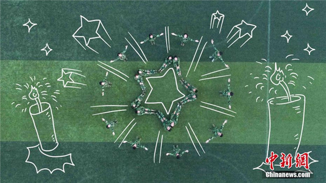 一提到軍訓(xùn),除了走方陣,站軍姿,你還能想到什么?近日,在福建師范大學(xué)協(xié)和學(xué)院2018級新生軍訓(xùn)場上,128位軍訓(xùn)新生以“閃閃紅星”“牢記八一”“嘹亮軍歌”等為題材拍攝出的一組航拍造型,并對照片進行手繪加工,記錄下了新生們不一樣的軍訓(xùn)瞬間。陳可涵 攝 劉少航 繪