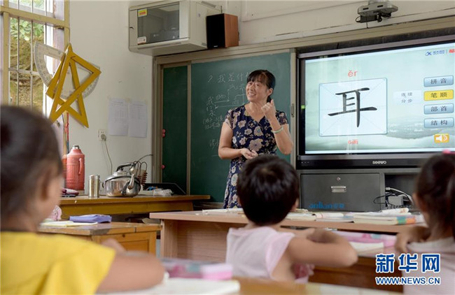 在安徽省黃山市黃山區(qū)烏石鎮(zhèn)清溪中心小學(xué)茶兒垅村教學(xué)點(diǎn)內(nèi),蔣秀蘭老師在給孩子們上語文課(9月7日攝)。今年53歲蔣秀蘭老師從1983年參加工作開始,一直獨(dú)自堅(jiān)守在“一人一校”的單班教學(xué)點(diǎn),最多的時(shí)候獨(dú)自一人帶過26名學(xué)生,目前她負(fù)責(zé)兩個(gè)年級(jí)5個(gè)孩子7門課的教學(xué)。 新華社記者 王正忠 攝