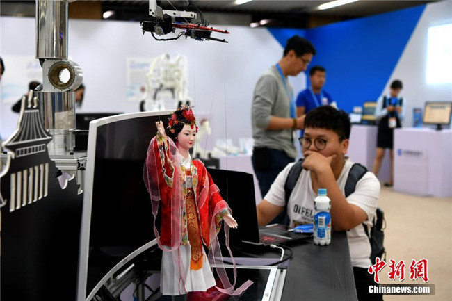 10月13日,第四屆中國(guó)“互聯(lián)網(wǎng)+”大學(xué)生創(chuàng)新創(chuàng)業(yè)大賽總決賽在廈門大學(xué)舉行。無(wú)人機(jī)、自助售飯機(jī)、人偶互動(dòng)、全息3D智能視頻、機(jī)器人輪椅、3D打印假肢手臂等大學(xué)生研發(fā)設(shè)計(jì)的產(chǎn)品亮相會(huì)場(chǎng),以“90后”為主的創(chuàng)新創(chuàng)業(yè)生力軍已全面發(fā)力,釋放出“青年+創(chuàng)新創(chuàng)業(yè)”的無(wú)窮力量。圖為人偶交互機(jī)器人展示。中新社記者 王東明 攝