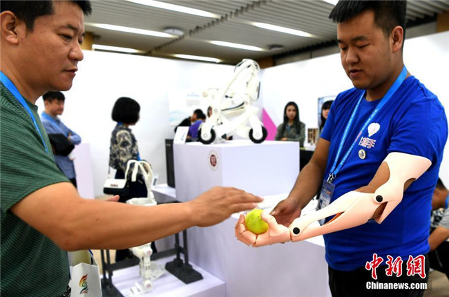10月13日,第四屆中國(guó)“互聯(lián)網(wǎng)+”大學(xué)生創(chuàng)新創(chuàng)業(yè)大賽總決賽在廈門大學(xué)舉行。無(wú)人機(jī)、自助售飯機(jī)、人偶互動(dòng)、全息3D智能視頻、機(jī)器人輪椅、3D打印假肢手臂等大學(xué)生研發(fā)設(shè)計(jì)的產(chǎn)品亮相會(huì)場(chǎng),以“90后”為主的創(chuàng)新創(chuàng)業(yè)生力軍已全面發(fā)力,釋放出“青年+創(chuàng)新創(chuàng)業(yè)”的無(wú)窮力量。圖為3D打印假肢手臂展示。中新社記者 王東明 攝