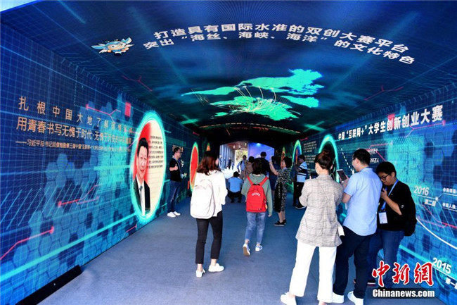 10月13日,第四屆中國(guó)“互聯(lián)網(wǎng)+”大學(xué)生創(chuàng)新創(chuàng)業(yè)大賽總決賽在廈門大學(xué)舉行。本屆大賽于今年3月份啟動(dòng),迄今累計(jì)已有近265萬(wàn)大學(xué)生、63萬(wàn)個(gè)團(tuán)隊(duì)參賽,涌現(xiàn)出一大批科技含量高、市場(chǎng)潛力大、社會(huì)效益好的高質(zhì)量項(xiàng)目,以“90后”為主的創(chuàng)新創(chuàng)業(yè)生力軍已全面發(fā)力,釋放出“青年+創(chuàng)新創(chuàng)業(yè)”的無(wú)窮力量。圖為創(chuàng)新隧道亮相廈大校園。中新社記者 王東明 攝