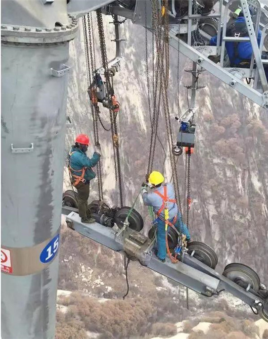 當(dāng)發(fā)現(xiàn)索道支架有異響時,維護(hù)工就要上支架了。從檢修車車廂里翻出來、順著掛在鋼索下的車臂攀緣上去,越過鋼絲繩,跨上支架,維護(hù)工開始工作。最高的支架65米,站在高聳入云的支架上,有一種站在懸崖邊的感覺。
