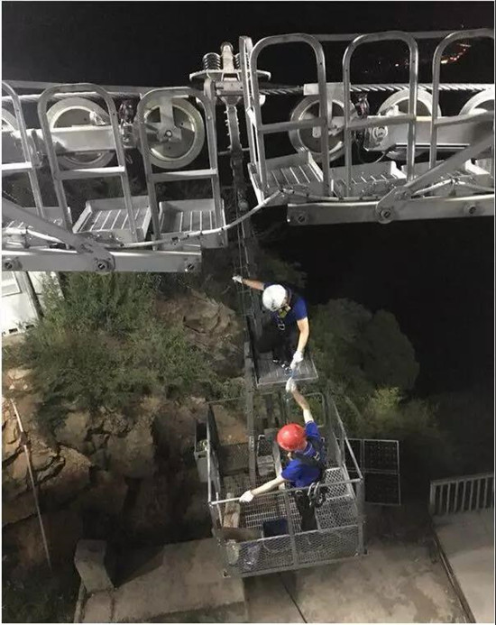 站在支架頂上,迪冰瑤用雙手將100斤重的導(dǎo)鏈吃力地舉過頭頂安裝固定好,然后開始校正鋼索。
