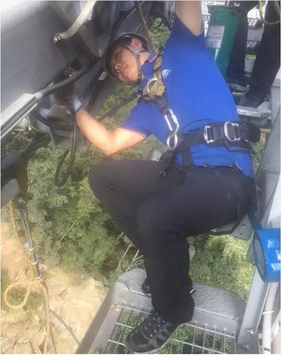 索道維護(hù)工每隔2小時坐檢修車沿索道線巡查一次。檢修車四面敞開、像個吊籃一樣。坐在全封閉的索艙里,尚有游客嚇得大喊大叫,站在四面敞開的檢修車上的感覺可想而知。