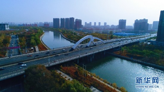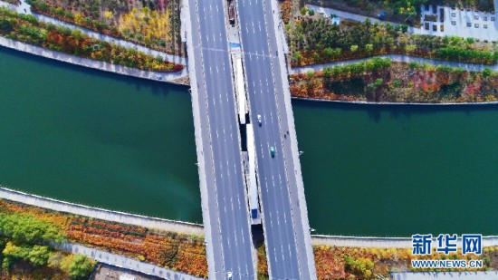 車輛從呼和浩特環(huán)城水系的一座橋上駛過。新華網(wǎng)發(fā) (樂炎 攝)