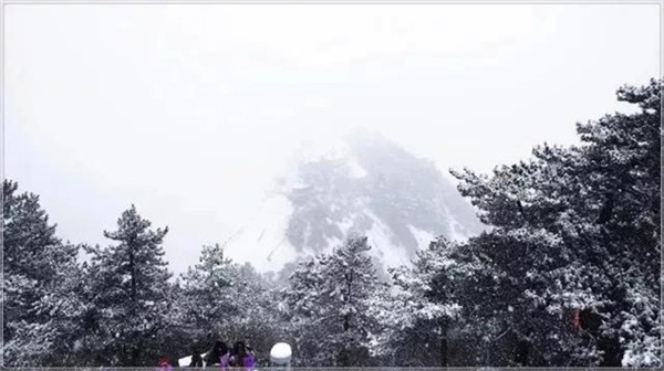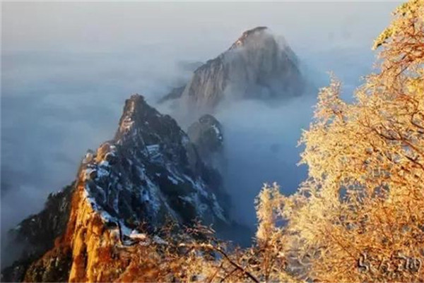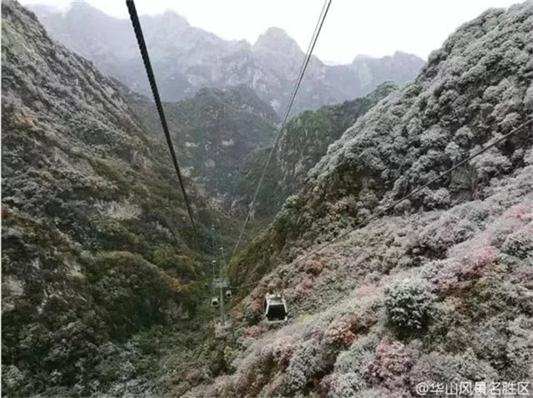 當滿山的紅葉還依舊掛在樹枝,露出嬌羞的笑臉時,秋末的華山,已經(jīng)下起了今年的第一場雪。放眼望去,整座山體好像被薄薄的彩衣包裹,若隱若現(xiàn)。