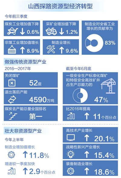 2017年,山西煤焦冶電傳統(tǒng)產(chǎn)業(yè)投資下降9.8%,而非傳統(tǒng)產(chǎn)業(yè)投資增長了22.9%;今年一季度采礦業(yè)投資下降6個百分點(diǎn),而制造業(yè)、高新技術(shù)產(chǎn)業(yè)投資分別增長12.7%、17.2%。