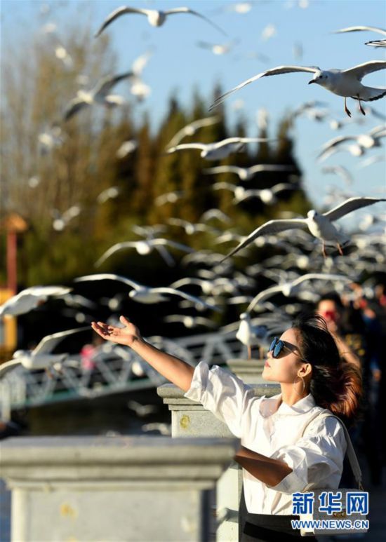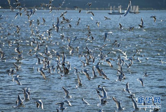 近日,云南省昆明市陽光明媚、氣候宜人,不少市民和游客來到滇池大壩、大觀公園等地,觀賞前來越冬的紅嘴鷗。新華社記者 藺以光 攝