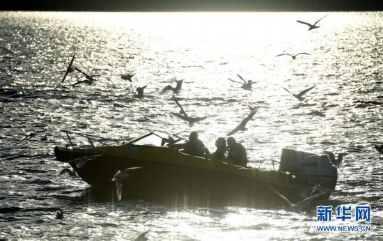 11月14日,人們在昆明滇池上乘坐游船與紅嘴鷗嬉戲?! ⌒氯A社記者 藺以光 攝