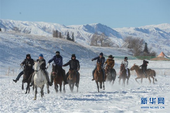 11月17日,當?shù)鼐用裨谘┑厣线M行賽馬比賽。當日,新疆那拉提冰雪旅游文化節(jié)在新疆新源縣那拉提旅游風景區(qū)開幕。此次冰雪節(jié)將舉辦滑雪運動會、雪地越野跑、雪地足球、雪地摔跤等活動,為游客帶來冰雪之樂。 新華社發(fā)(丁磊 攝)
