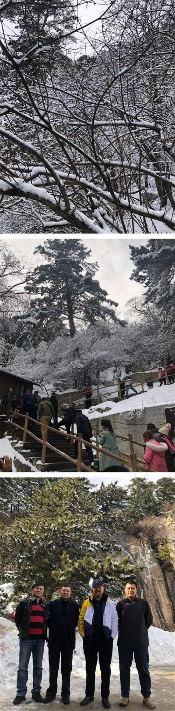 此時的華山正是雪季,華山的雪景不僅是銀白的世界,而是猶如千姿百態(tài)的雪雕。雪霽,便有“林海玉樹”、“雪堆玉石”、“云中雪龍”、“巖崖雪屋”、“梨花飛揚”、“天女散花”、“紅帶玉墜”等各具形態(tài)的奇特景觀。置身在雪的境界,神清氣爽,洗心革面,冰清玉潔,忘卻凡塵。